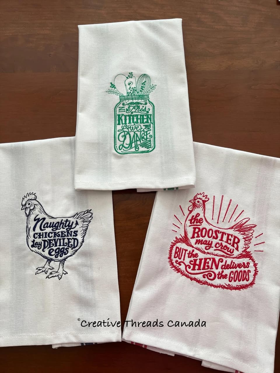 | Towel Design | Naughty Chickens (navy), In this Kitchen We Dance (green), The Rooster May Crow (red) |